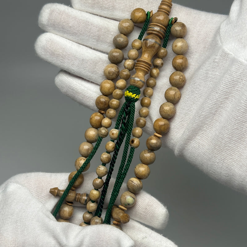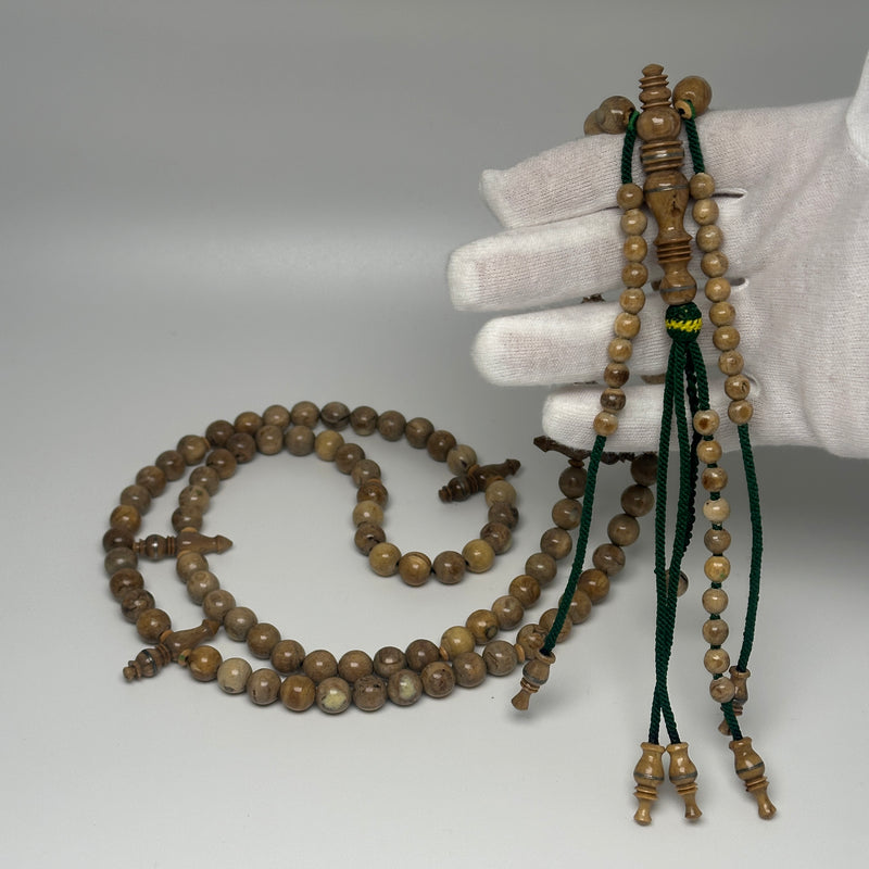 Tasbih Tijani en Yusr Khor 10 mm – Corail blanc, Ficelle verte | Kourous Artisanal