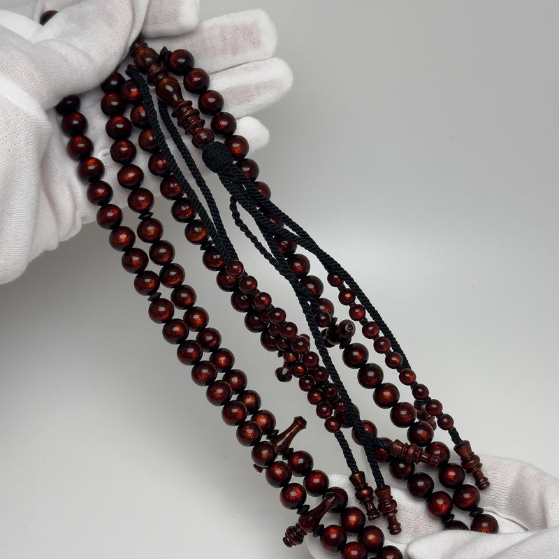 Chaque Kourous Tijani est façonné entièrement à la main en Indonésie par des artisans disciples de la Tariqa Tijaniyya, suivant un savoir-faire ancestral transmis de maître à élève. L’assemblage garantit un tasbih équilibré, solide et agréable en main pour accompagner vos oraisons quotidiennes.